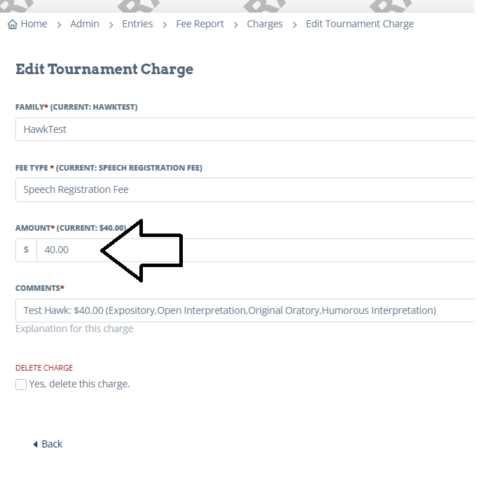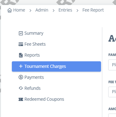 This means that the family owes money. You don't want to give a refund here, or else it will show they owe more money. Let's say you want to make their payment due go away. You can delete charges to bring the Payment Due to zero by going to Tournament Charges.