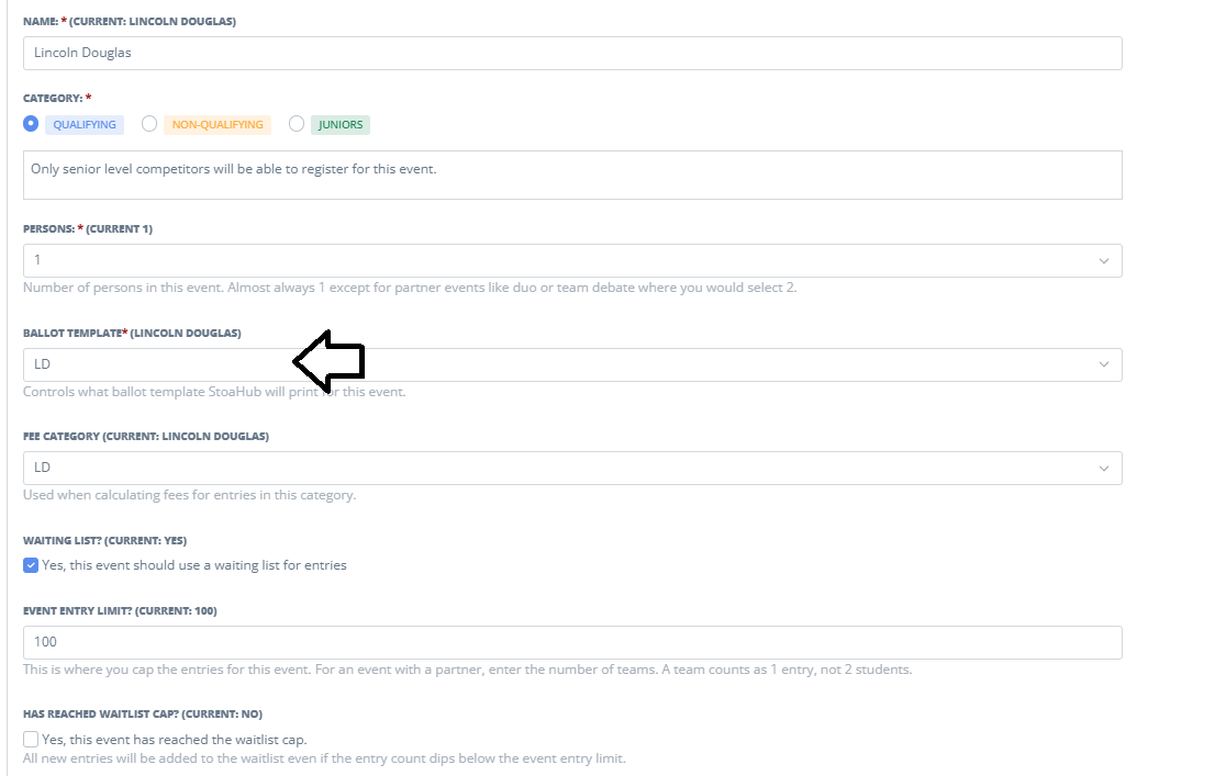 Under "Main", make sure the "Ballot Template" is whichever debate event you have selected.