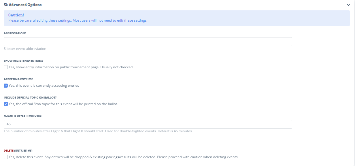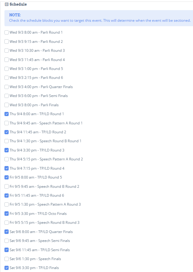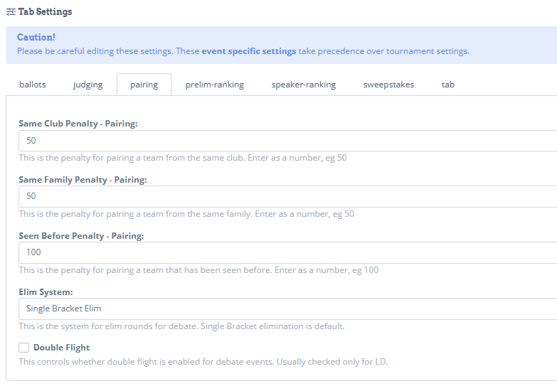 Double Flight - This controls whether double flight is enabled for debate events. Usually checked only for LD. Check this box if you are double flighting LD.