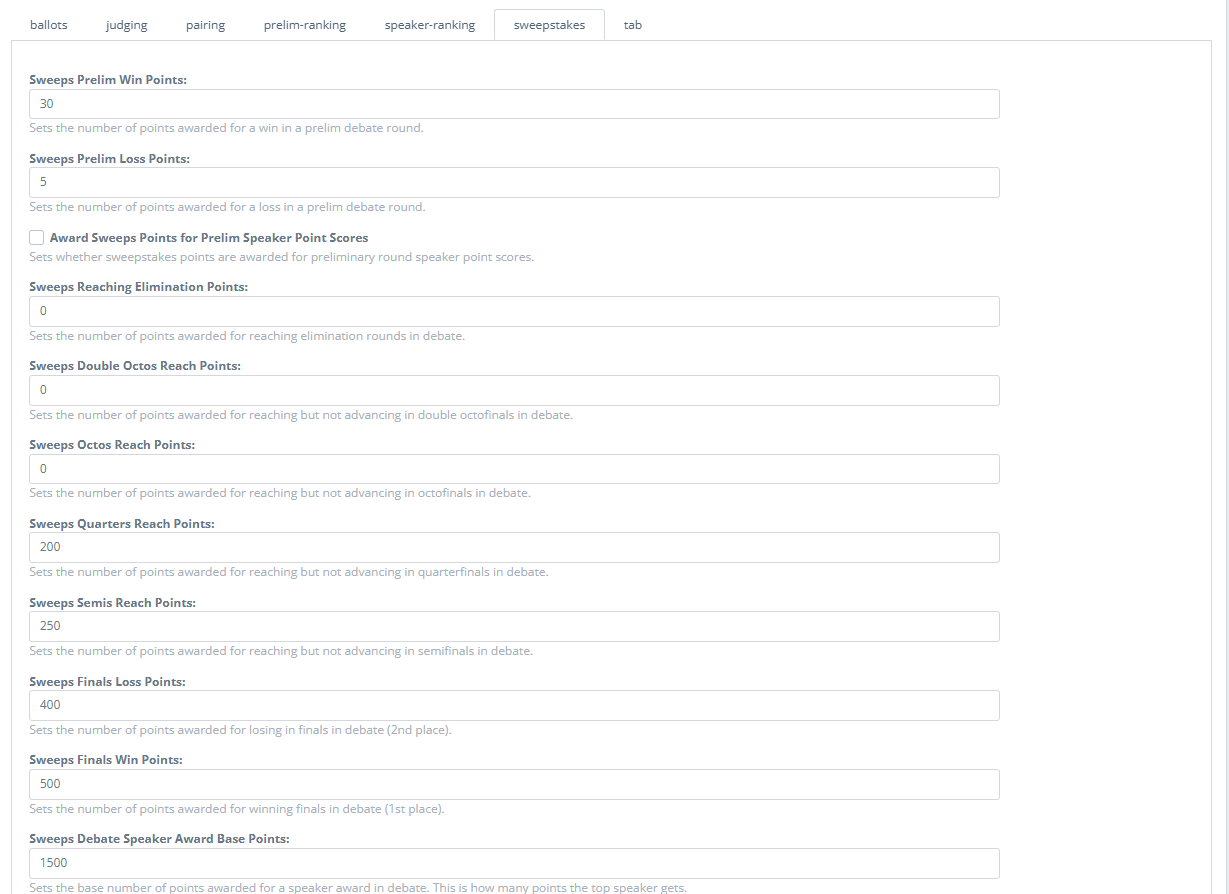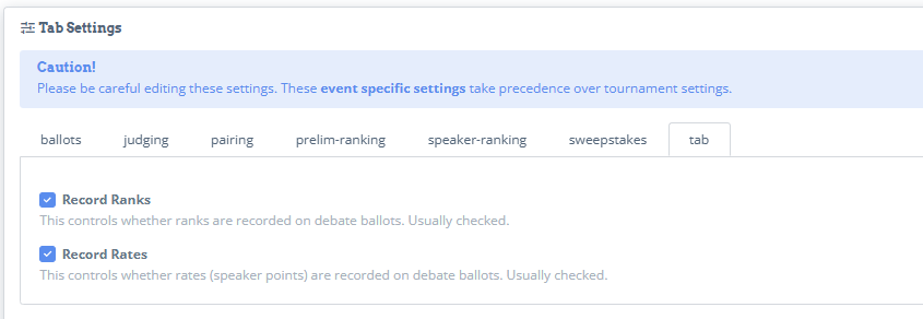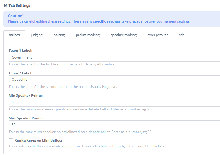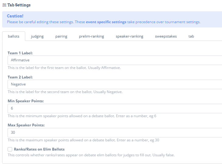Under "tab", you can set a "Max Rank Prelim", which means if you have 6 kids in a room, you want 6 to be the max rank so if you accidentally enter a 7, you'll get an error. For "Max Rank Elims", you'll want to enter the amount of students who are breaking to finals.