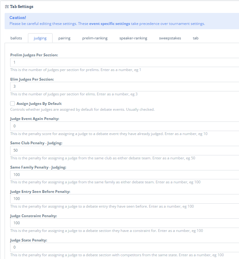 You can determine the default of how many judges per prelims (almost always 1), and elims (you should start with 3). Tab can change them at the time of pairing the round.