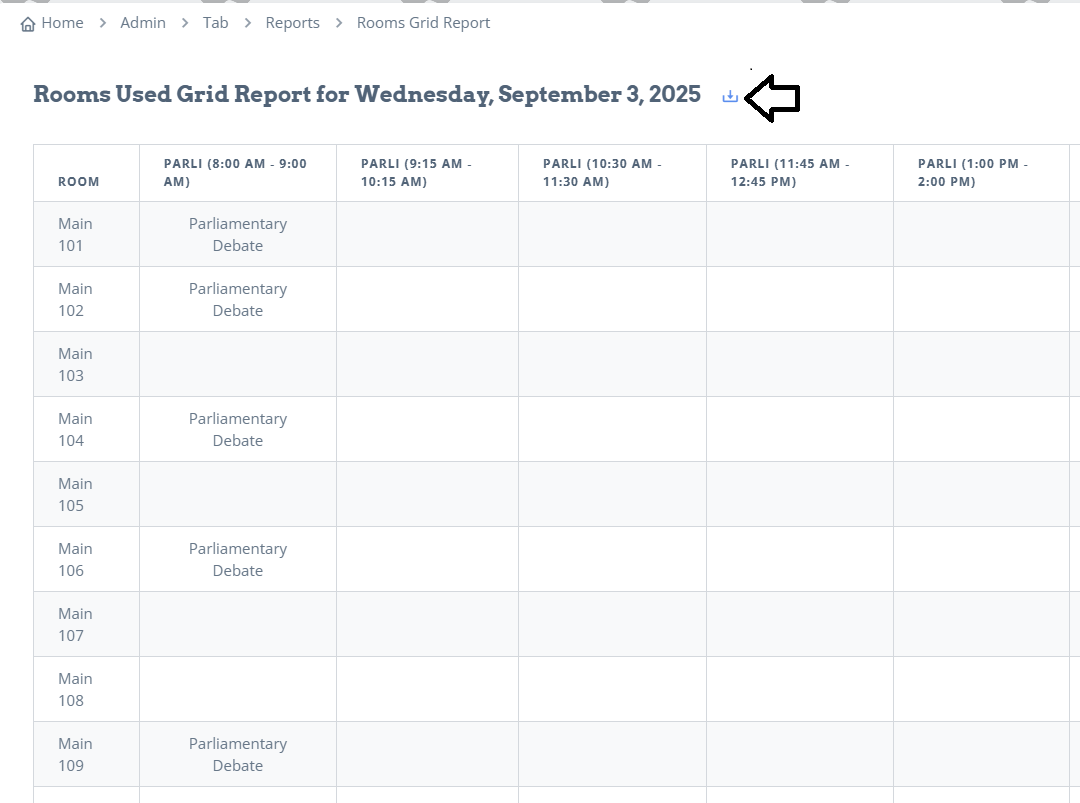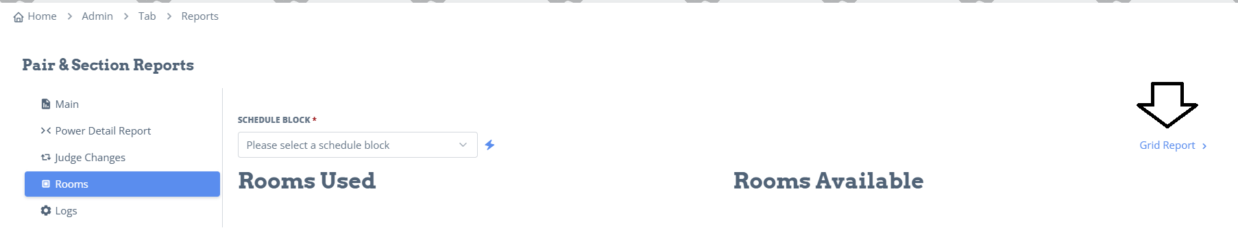 For a Room Grid Report, that will show all the schedule blocks, the rooms, and what events are in the rooms, go to Admin-Tab-Reports-Rooms-Grid Report