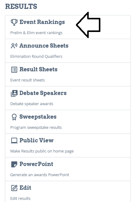 Select the event you want rankings for. You then can choose Prelim rankings, Elim Rankings, or Final Rankings. You can have them on the screen or to a pdf.