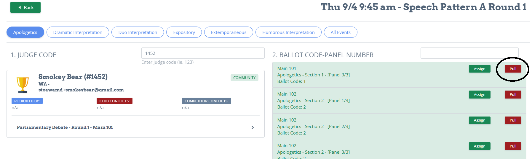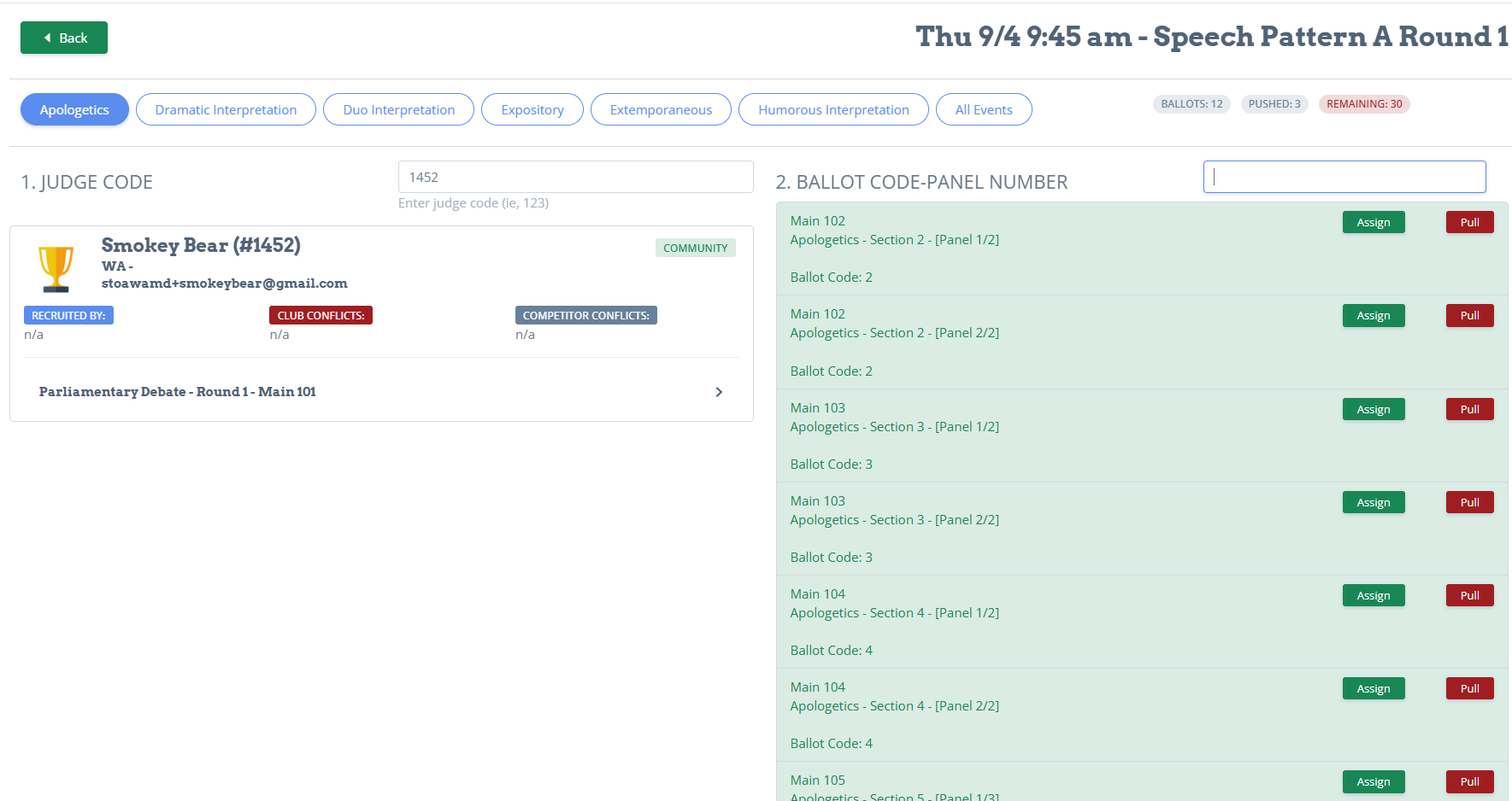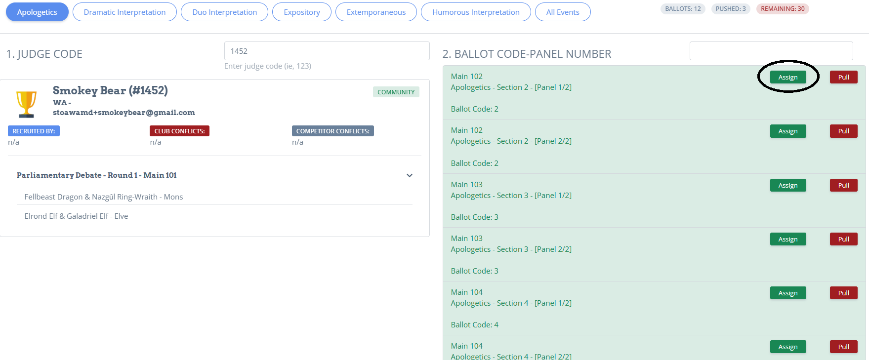 You'll see the list of ballots on the right. Green means there are no conflicts and you should attempt to assign that ballot by having that judge verify that it's ok. If it is, click assign.