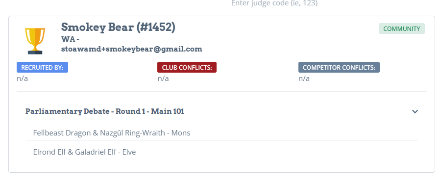 The judge standing in front of you has a badge with both a judge number and a barcode. You can either scan the judge barcode, type the judge number, or search for the judge by name. Let's use the example of Smokey Bear #1452.