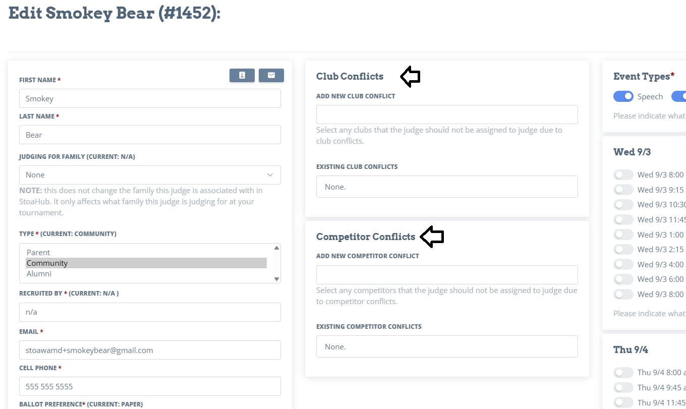 Click on their profile and add the conflicts. Then click "Update" on the bottom right.