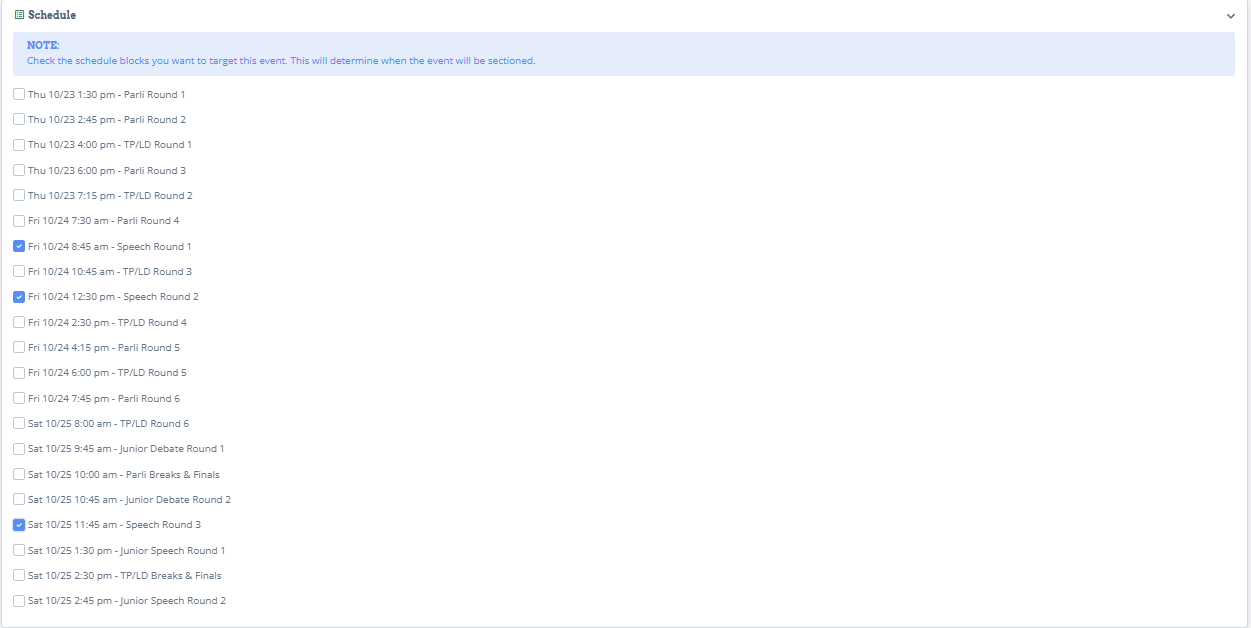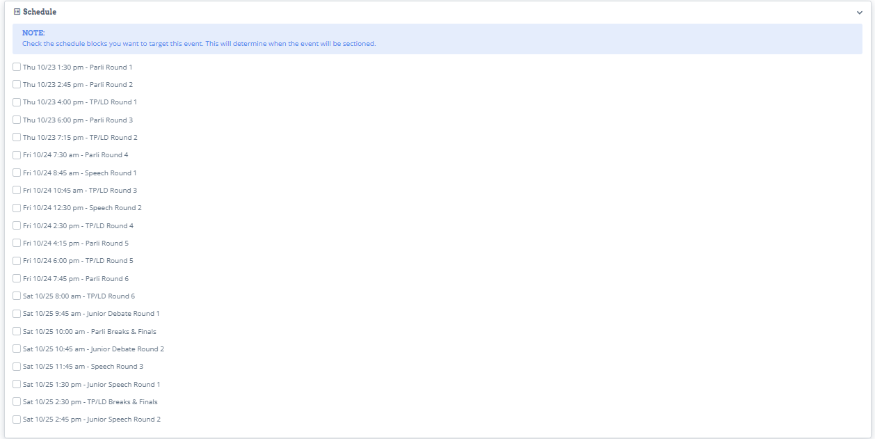 Make sure that each event is selected in the correct schedule block that it belongs to.