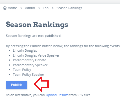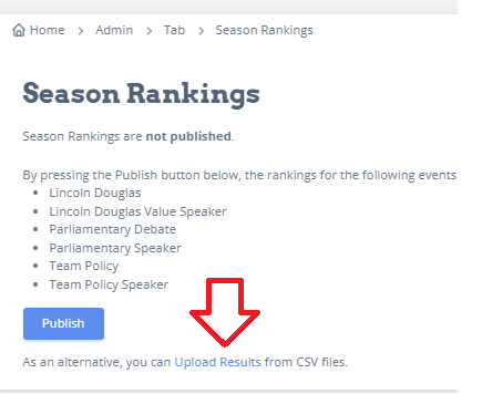 If you tabbed in StoaHub, uploading is straightforward. After your tournament is complete, click on Admin-Tab-Results-Season Rankings.
