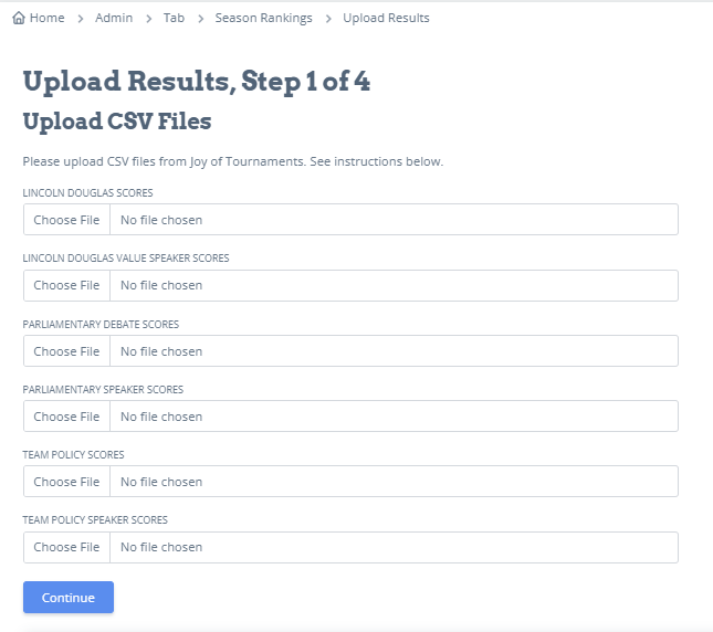 Once you have all your CSV files, go to "Upload Results" and follow the prompts. It says from Joy, but its any CSV. *NOTE* you must upload all the events at once. You can't upload some and not others. This is only temporary.