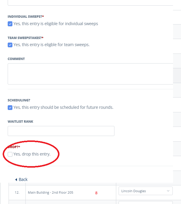 Go to Admin-Entries-Event Entries. Find the student and click on them. Click on the event they are dropping. Find the box that says "Scheduling: Yes, this entry should be scheduled for future rounds." UNCHECK that box and hit "Update". Note: Do NOT drop the entry if they have already competed in at least 1 round.