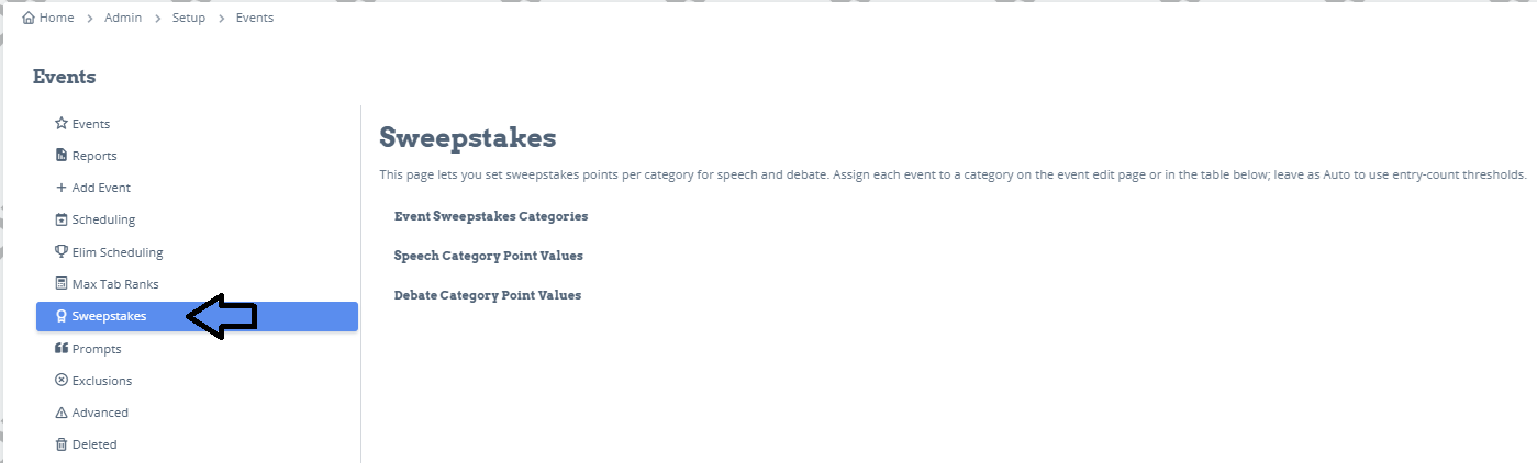 Under Setup-Events, you'll find a tab labeled Sweepstakes. This is where you will set up your sweepstakes for the tournament.