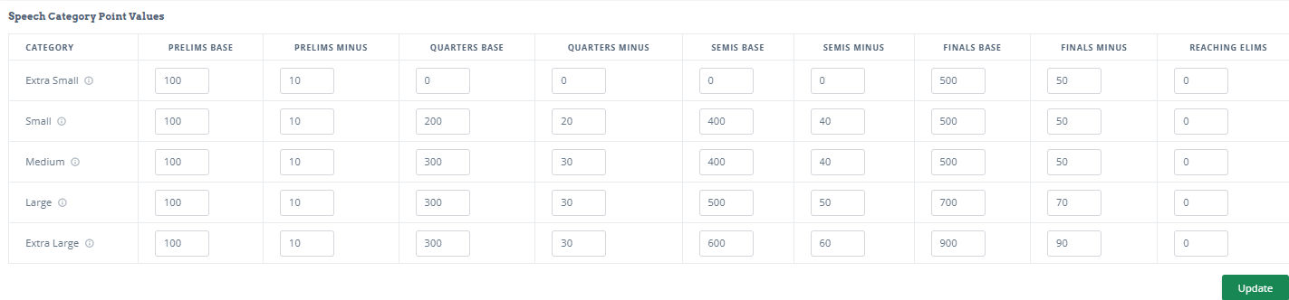 For debate speakers, you can enter the overall total points the winner will get, and then each place after that gets minus what you put in the minus column. For instance, if first gets 800, then second gets minus 80 (10%), which would be 720. Third place gets minus 80, which would be 640, and so on. All of these calculations are done automatically.