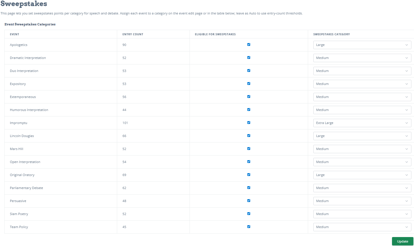 The first is Event Sweepstakes Categories. This lists all of the events at your tournament. The Entry Count is taken straight from your registration automatically. You can choose which events will count towards the sweepstakes. The Sweepstakes Category is based on the entries in each event. You can change the categories manually if you want.